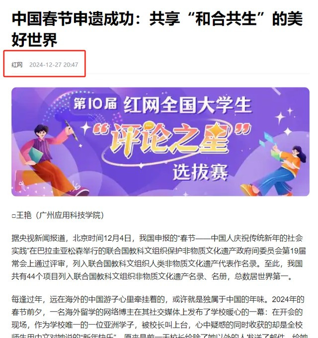 (信源:红网2024年12月27日—中国春节申遗告捷:分享“和合共生”的好意思好世界)