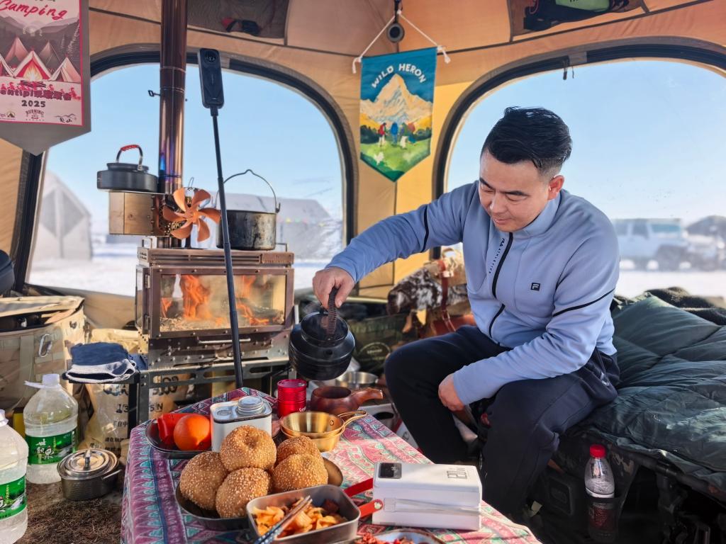 来自吉林的营友王凯在帐篷里喝茶。新华社记者 张玥 摄