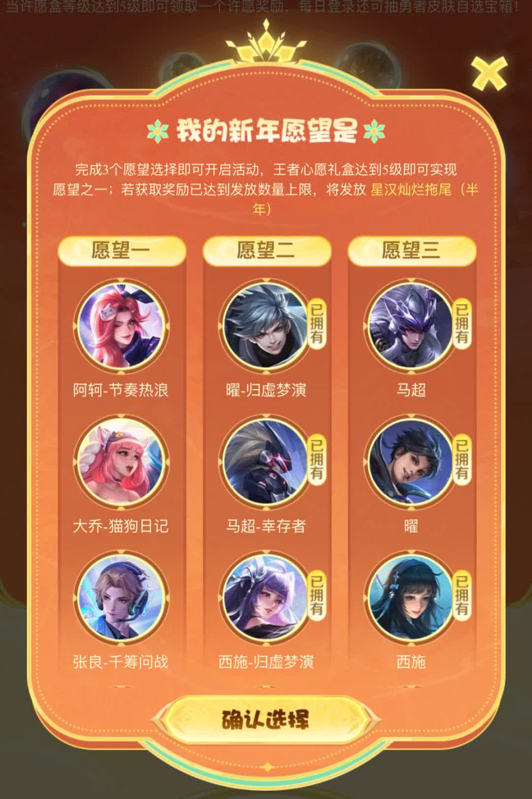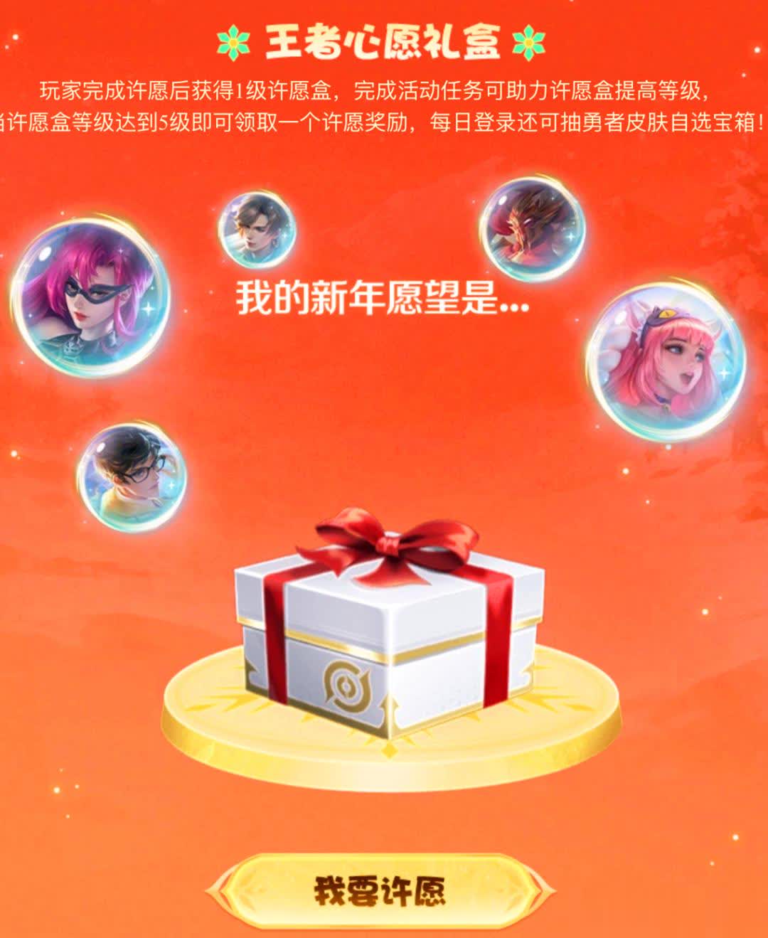 第一步,率先是玩家需要许三个愿望,心愿品级达到五级的时候智力开启,而第一心愿即是史诗级皮肤了,第二心愿是勇者级皮肤,第三心愿是硬汉,思要快速的升级许诺盒品级,队友是不错助力的。