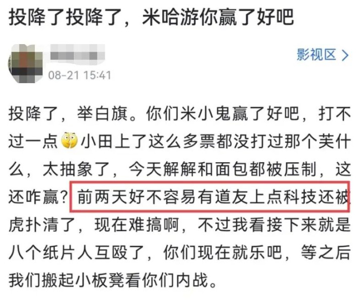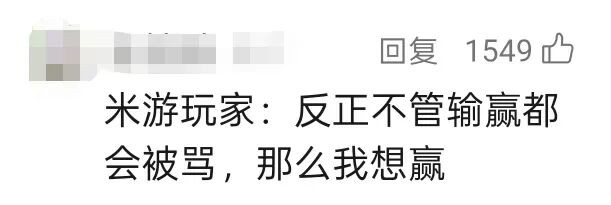 可惜的是,一次完胜并不行变嫌外界对米哈游玩家的刻板印象。就像指摘区所说的,对反米群体来说:赢便是证明米哈游比明星饭圈还饭圈,输便是证明米哈游还是东谈主气不再“路边一条”。反恰是输是赢都是要被黑,那么不如赢了再说。