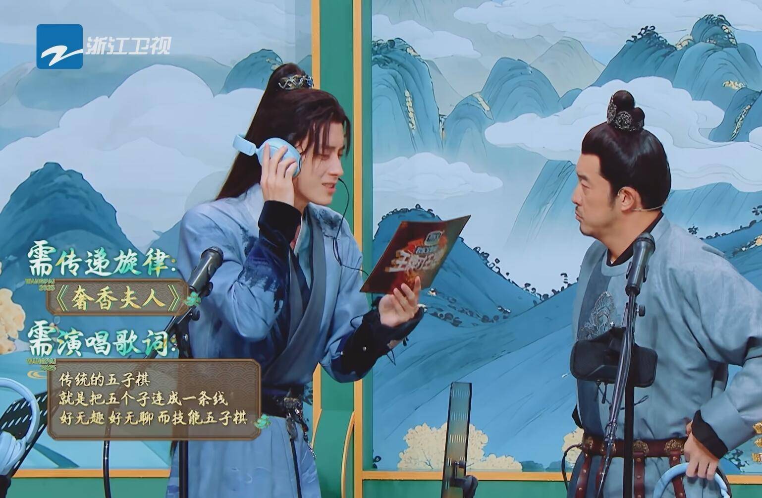 在一个传递歌曲的游戏中,每个东说念主王人戴着耳机,需要传递前边一个东说念主唱出的调,然而要用题板上的歌词。