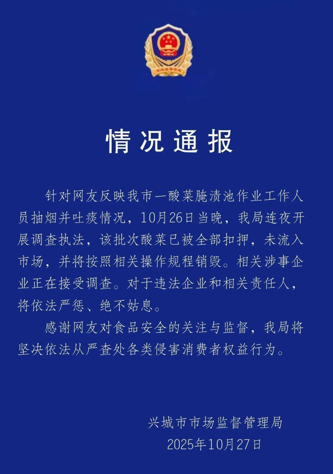 近日,一段疑似拍摄于酸菜企业的视频激发网友愤激,视频中,一男人站在酸菜池中责任,全程吸烟,并在酸菜池中随口乱吐。10月27日开yun体育网,辽宁省兴城市市集监督惩处局发布情况通报:针对网友反馈我市一酸菜腌渍池功课责任主说念主员吸烟并吐痰情况,10月26日当晚,我局连夜开展拜访规矩,该批次酸菜已被一说念扣押,未流入市集,并将按摄影干操作规程葬送。相过问事企业正在摄取拜访。关于积恶企业和相干包袱东说念主,将照章重办、毫不姑息。感谢网友对食物安全的柔柔与监督,我局将刚烈照章从严查处各样侵害毁坏者职权当作。